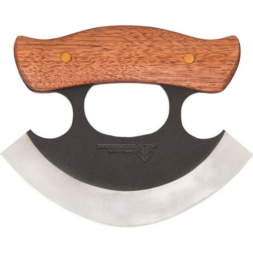 Blue Ridge Knives5.5" (13.97cm) rough forged 1095HC steel ulu blade. Wood handle. Full tang.4.5" handle. Brown leather belt sheath.