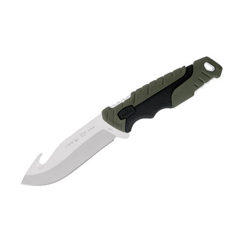 Buck9.5" overall. 4.5" satin finish 420HC stainless guthook blade. Black glass filled nylon handle with green Versaflex onlay. Full tang. Lanyard hole....