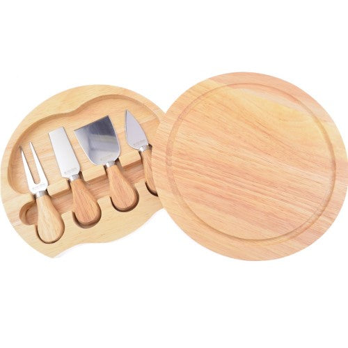 Includes: Plane knife for semi-firm cheeses; Spatula knife for soft cheeses; All-purpose heart-shaped cheese knife; Serving fork. 8.66 diameter wooden cheese/cutting board. Four serving pieces store inside. Swivel open design.