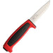 8 1/4" overall. 3 5/8" carbon steel blade. Red & Black polypropylene handle. Red molded plastic belt sheath with drain hole.